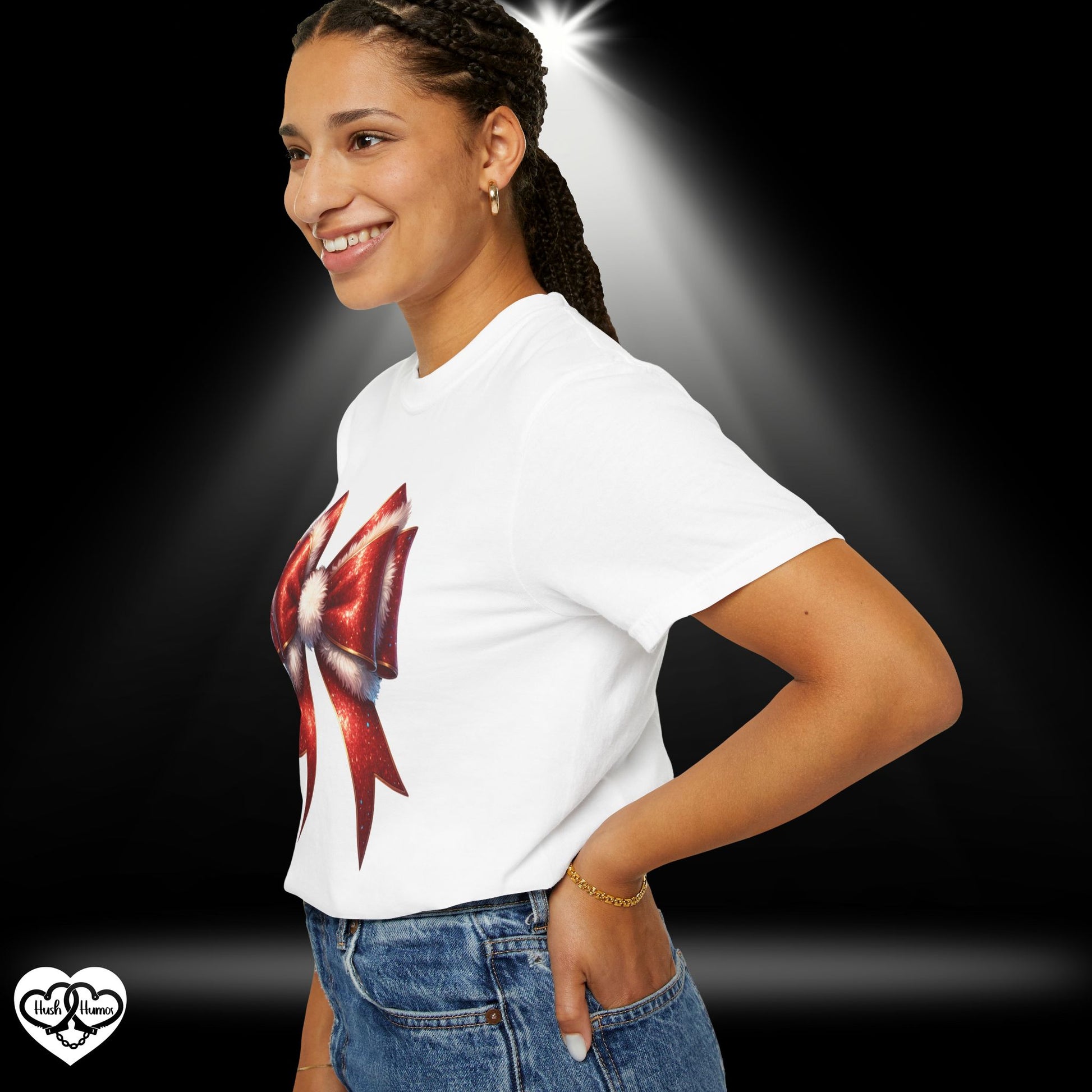 Be his favorite gift this year — wrapped up in nothing but a bow. 🎀 This sexy Christmas tee is playful, naughty, and perfect for adding a little spice to the holiday season. With a bold red bow graphic front and center, it makes the ultimate flirty party shirt or cheeky gift for your partner.