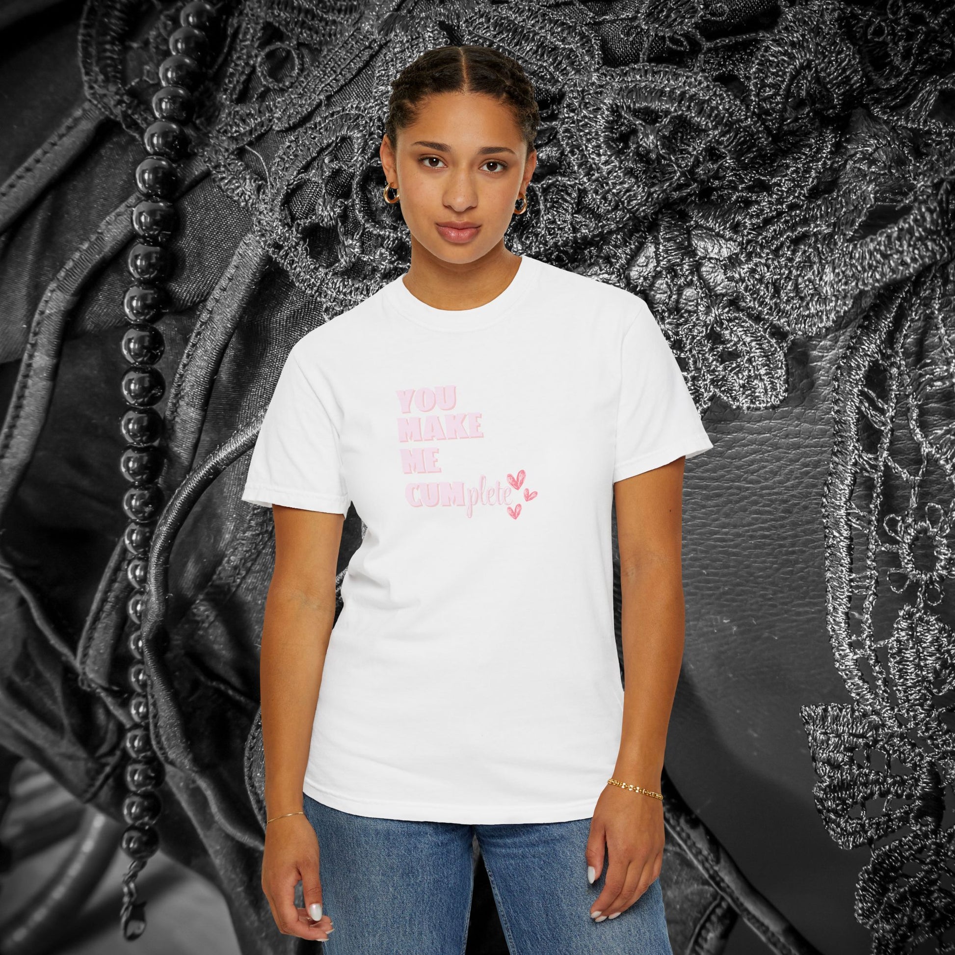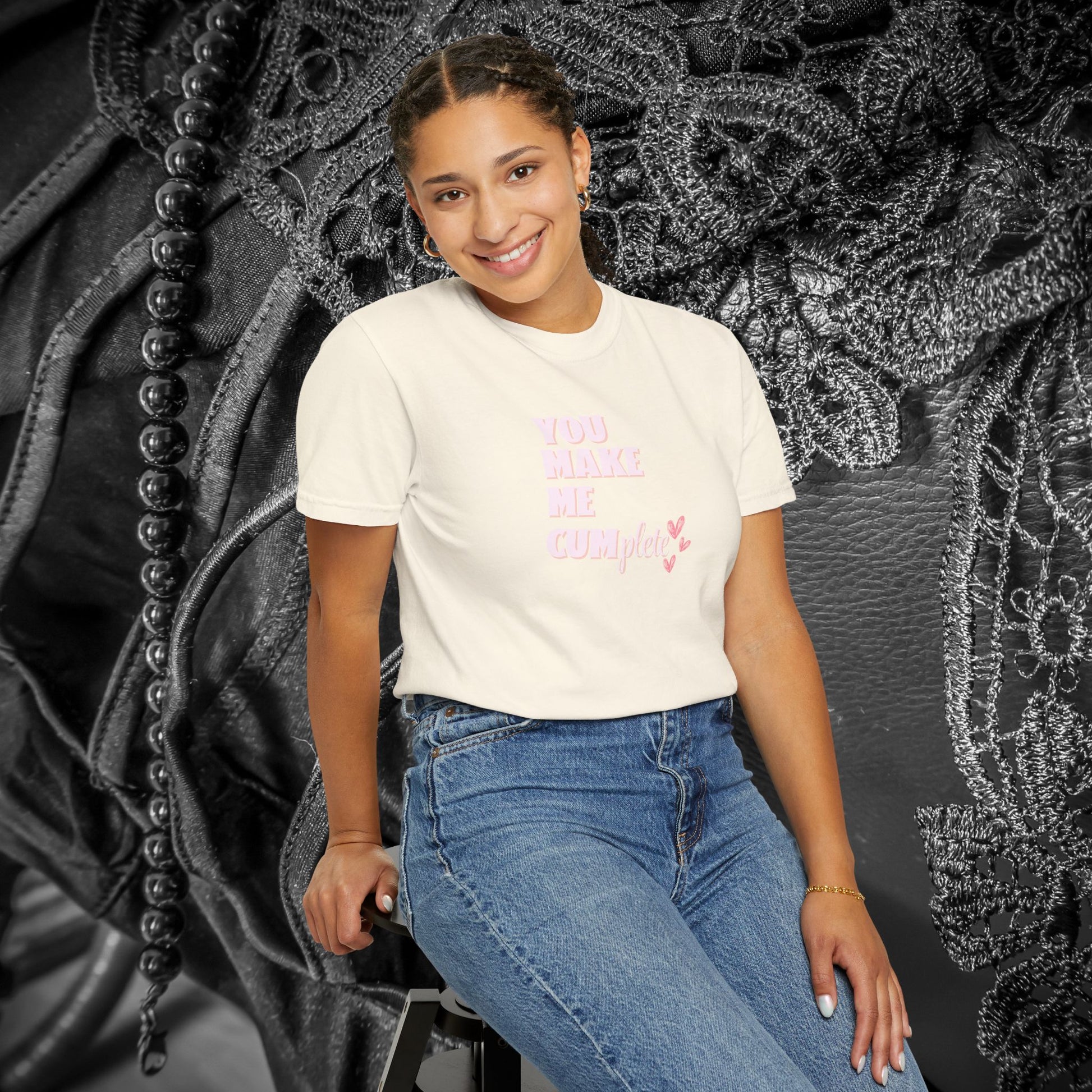 The “You Make Me Cumplete” tee delivers the perfect mix of dirty humor and cheeky charm. Ideal as a gag gift, a funny wife surprise, or for anyone who appreciates sarcastic sass, this shirt brings laughs everywhere it goes. Soft, durable, and made to be just as bold as the person wearing it.