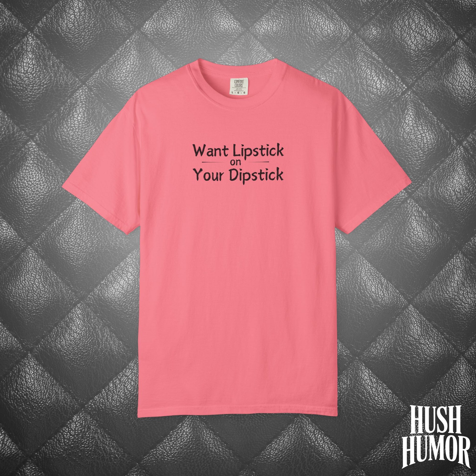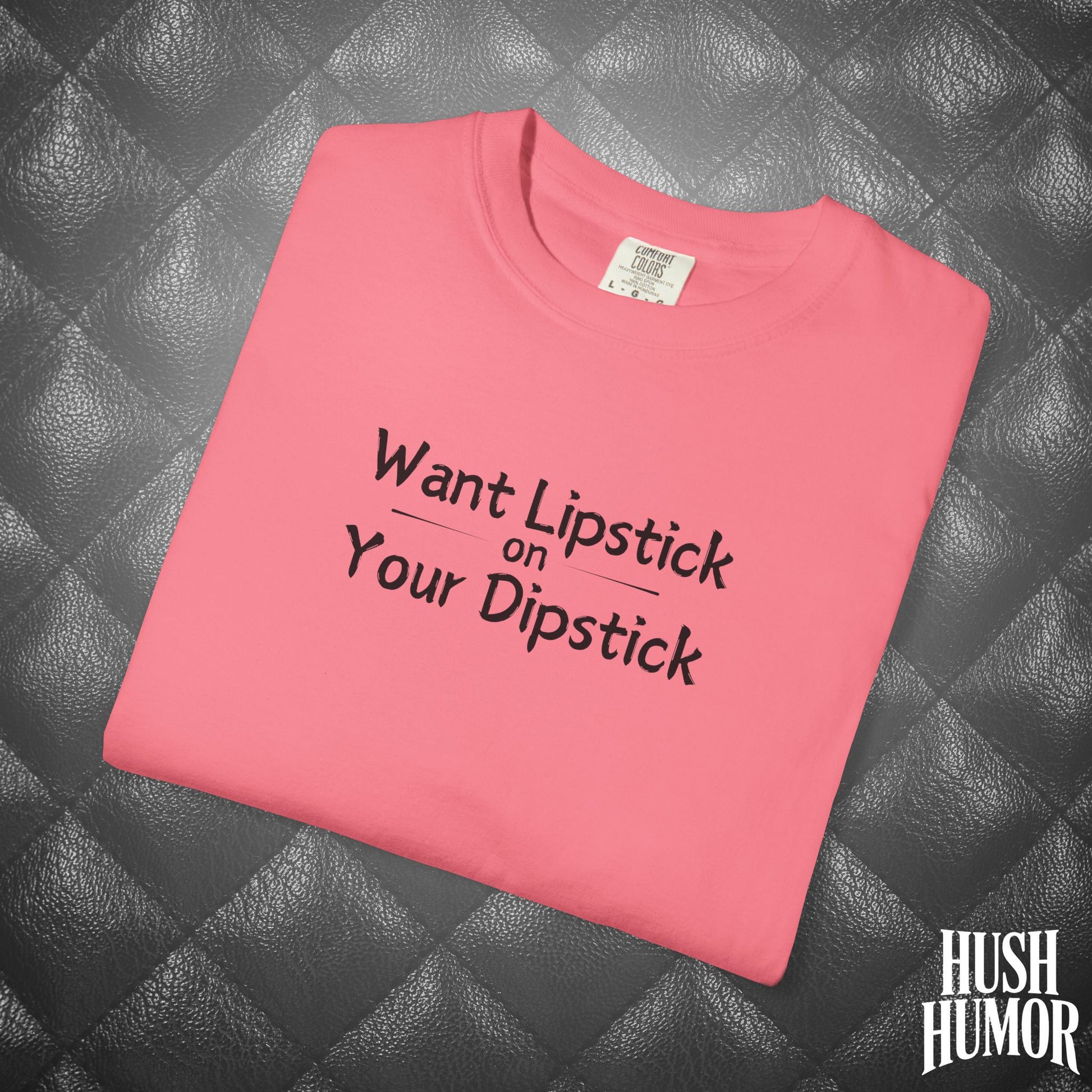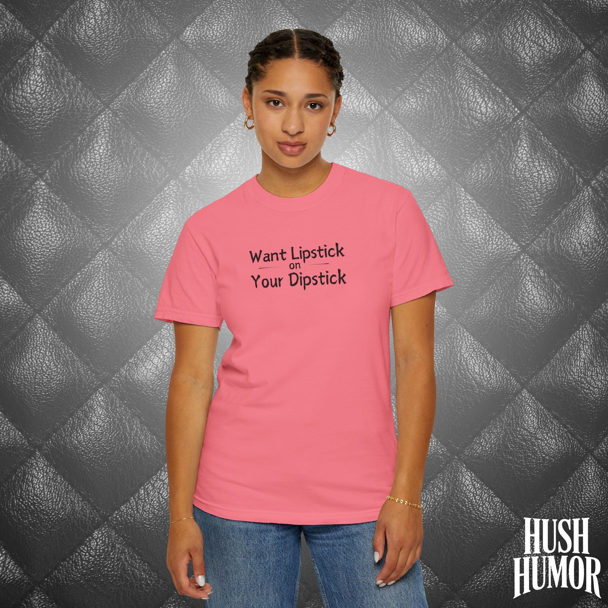 Lipstick on Your Dipstick T-Shirt | Naughty fun Oral Skils Tee for Women | Dirty Funny Sex Shirt | Inappropriate Bold Adult Party Apparel
