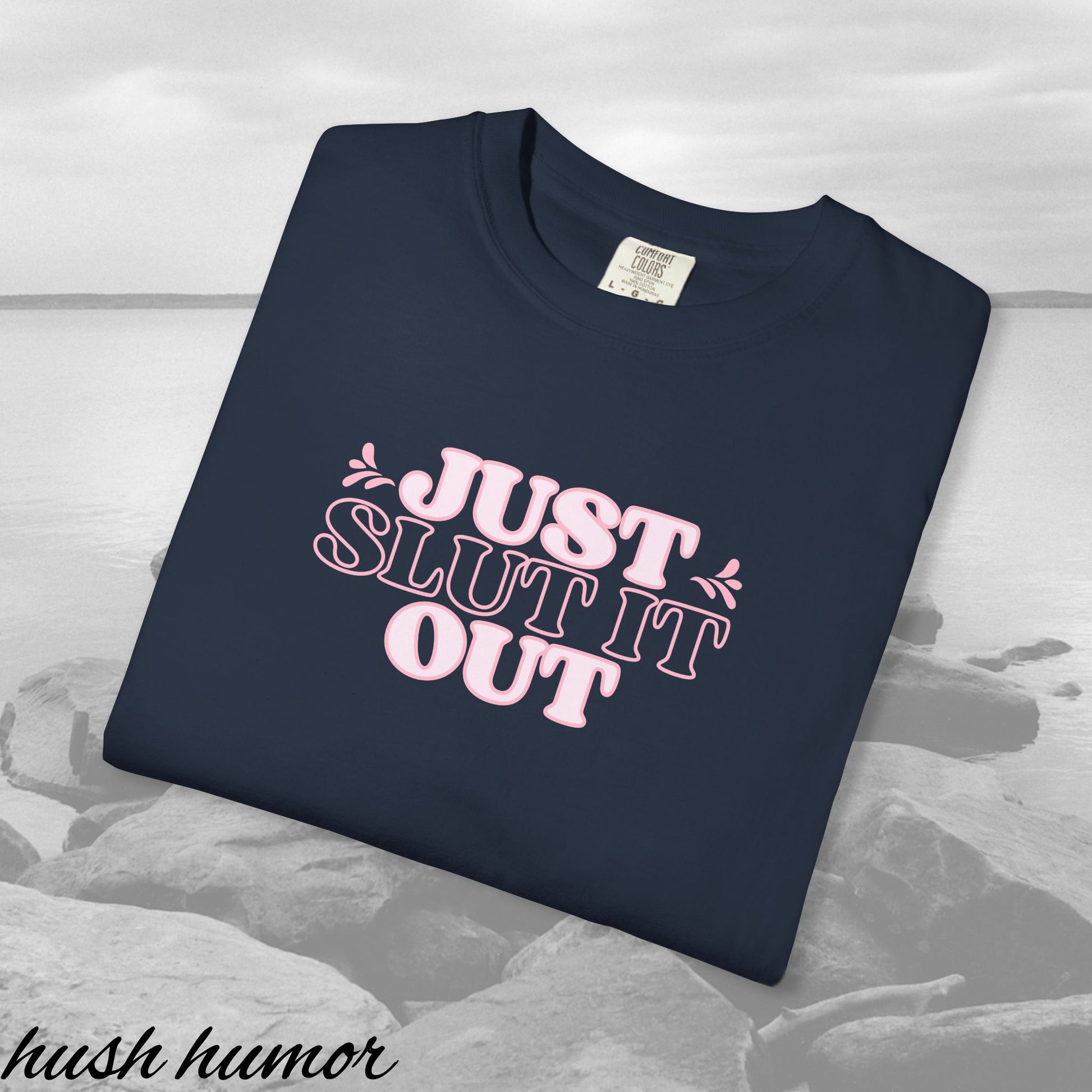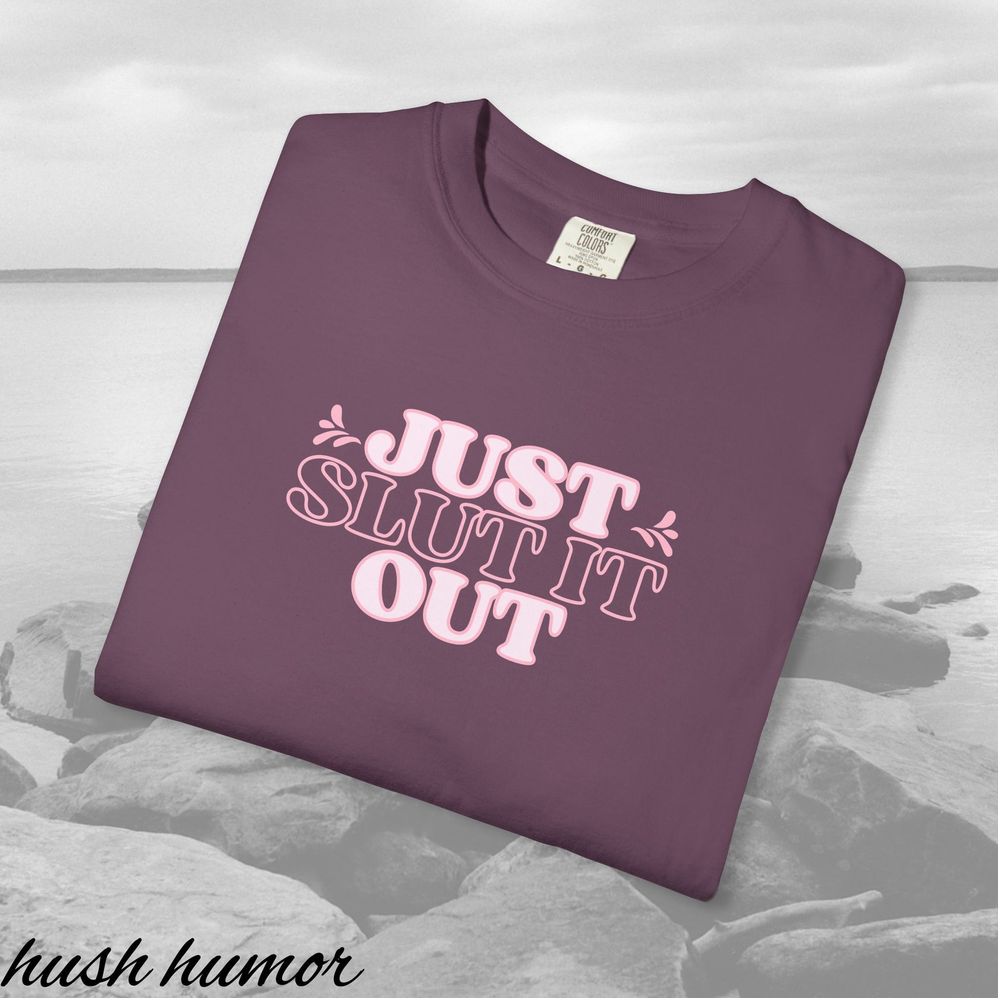 Just Slut it Out Tee, NSFW Rude party apparel, fun trendy summer party tshirt